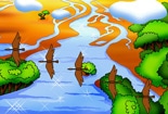 “於是乎长鲸吞航,修鲵吐浪。跃龙腾蛇,鲛鲻琵琶。王鲔鯸鲐,鮣龟鱕?昔。乌贼拥剑,鼊鲭鳄。涵泳乎其中。葺鳞镂甲,诡类舛错。溯洄顺流,噞喁沈浮。鸟则鹍鸡鸀鳿\\\,鹴鹄鹭鸿。鶢鶋避风,候雁造江。鸂敕?鷛渠?, 鹤鹙鸧。鹳鸥鹢鸬,氾滥乎其上。湛淡羽仪,随波参差。理翮整翰,容与自玩。雕啄蔓藻,刷荡漪澜。鱼鸟聱耴,万物蠢生。芒芒黖々,慌罔奄欻,神化翕忽,函幽育明。穷性极形,盈虚自然。蚌蛤珠胎,与月亏全。巨鳌赑屃,首冠灵山。大鹏缤翻,翼若垂天。振荡汪流,雷抃重渊。殷动宇宙,胡可胜原!